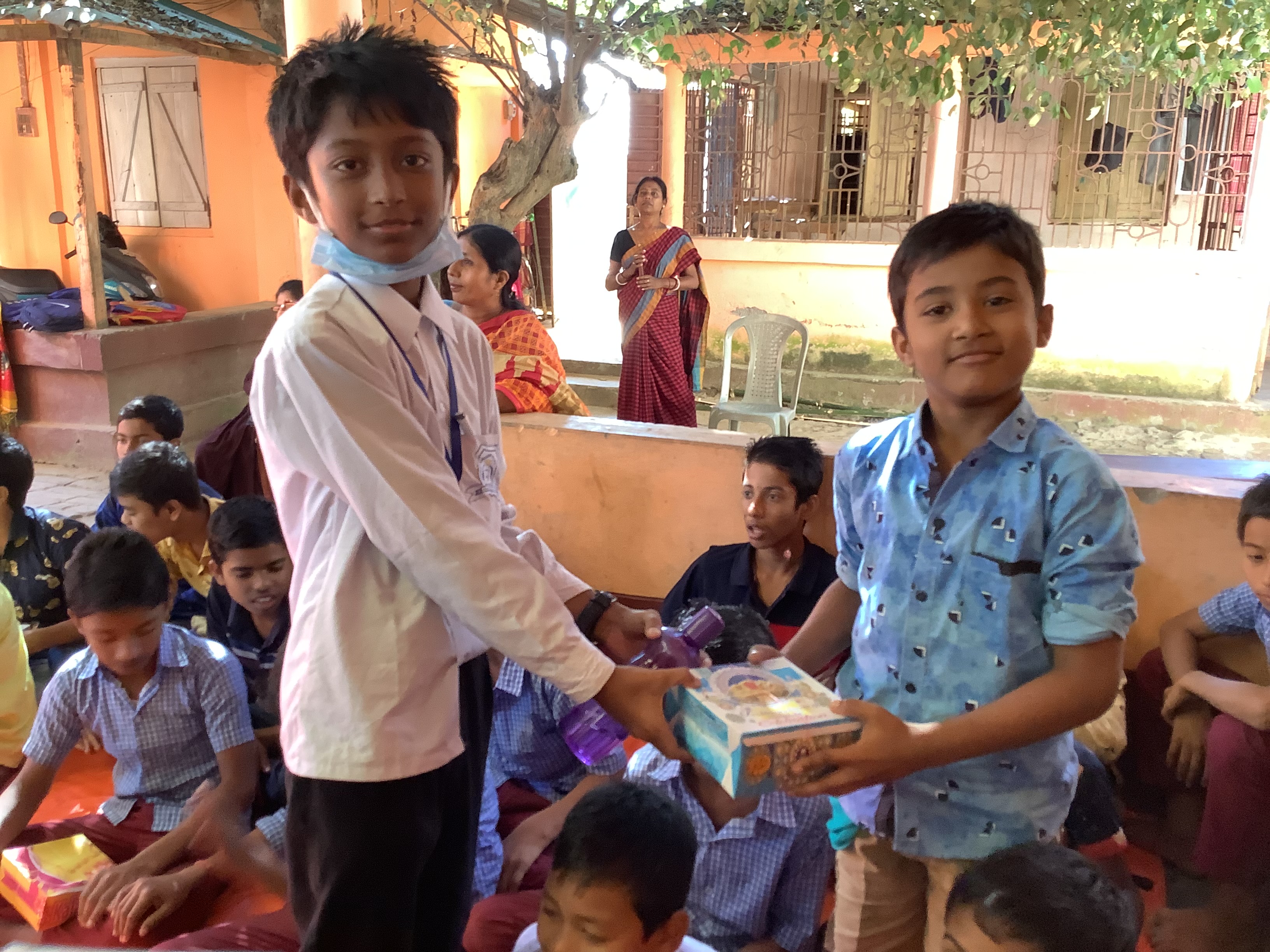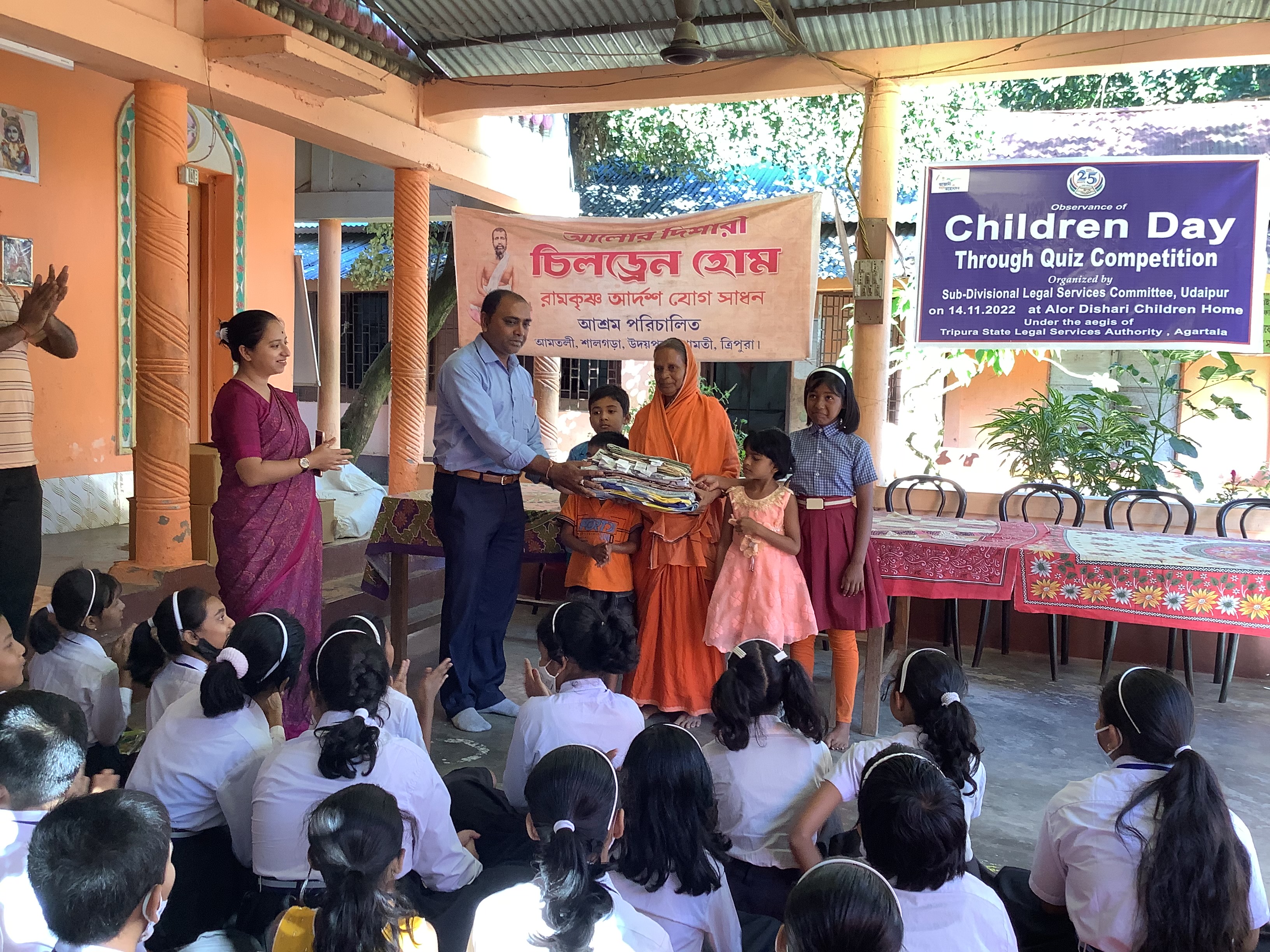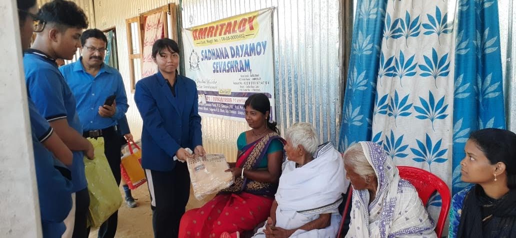 Proceeding to the next phase of the Service Act, as per the plan, the students along with their teachers spread all around the Udaipur town- Some students went to the surrounding village, some went to two brick industries, Chandrapur; some went to an orphanage home, Amtali; some went to an old age home, Sadhana Dayamoy Sevashram and some went to the sub-division hospital. They spent their quality time with the people, trying to understand their struggles and needs. Books, pens, pencils, erasers, and sharpeners were given to the children of poor families in the neighbourhood community. Old clothes were distributed among the labourers and their families at the brick industries. Blankets were given to the needy people in various areas of the town and in the old age home. Bed sheets, pillow covers and fruits were given to the orphans in the children’s home. Fruits were distributed to patients, doctors, nurses and other staff of the subdivision hospital.